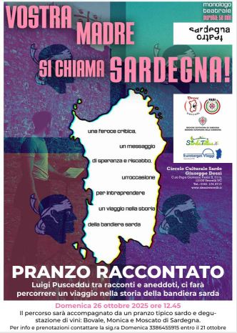 26 ottobre "VOSTRA MADRE SI CHIAMA SARDEGNA" pranzo con degustazione di prodotti tipici del territorio sardo accompagnato dal racconto di Luigi Pusceddu sull'origine e la storia della bandiera sarda.