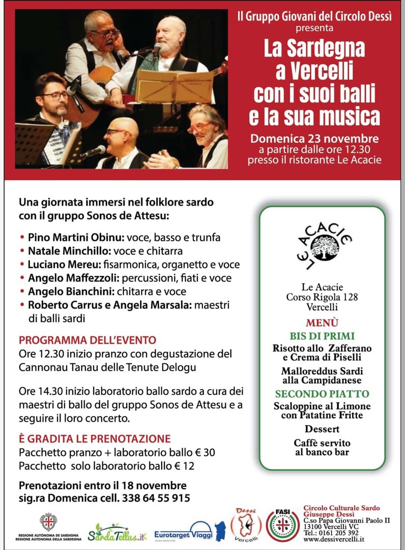 23 novembre Al ristorante le acacie Pranzo con degustazione vini sardi e a seguire laboratorio di ballo sardo e concerto del gruppo sonos de attesu